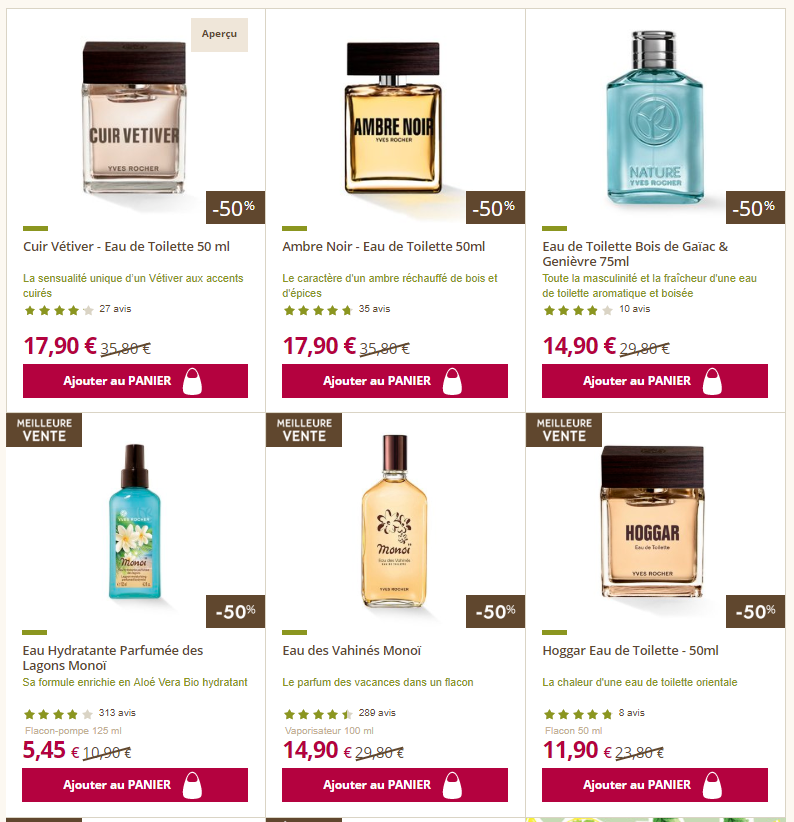 예를 들면 향수, 크림 등등. 지금 이브로쉐에서는 향수와 200가지 넘는 제품이 할인을 하고 있어요. 대부분 기초 화장품과 향수 입니다. 지금 프랑스에 계시다면 한번 방문해서 구경해 볼 만합니다. 그리고 이브로쉐 향수는 한국에서 흔하지 않기 때문에 조금 저렴하고 독특한 향수를 찾는 분이라면 지금 이브로쉐에 가보는 것도 좋다고 생각합니다.