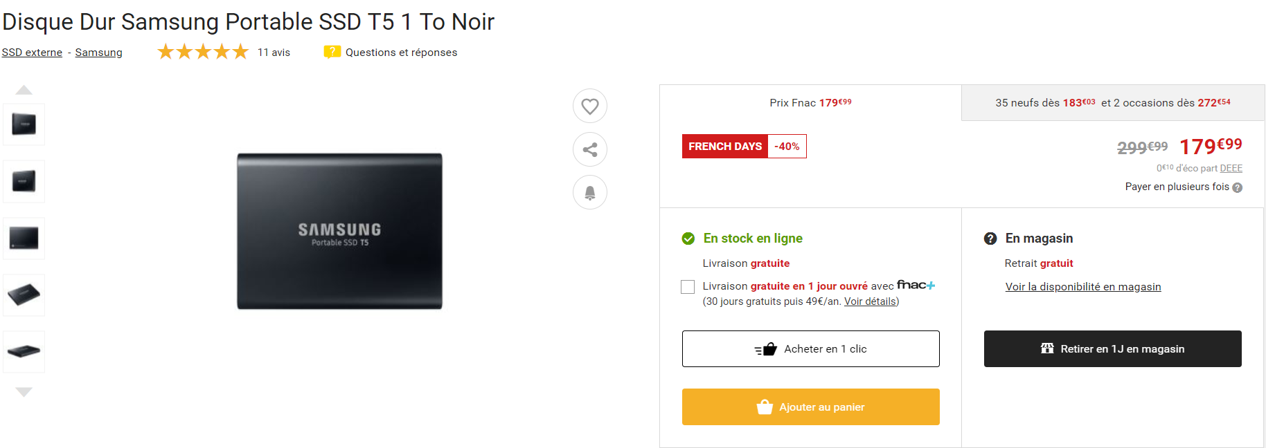 FRENCH DAY라고 해서 지금 프랑스 대부분의 브랜드,매장에서 할인을 합니다. 하지만 항상 프랑스는 할인 하는 제품의 가격도 다시한번 확인 해봐야해요. 물론 저렴한 제품도 많지만 이렇게 예를 들면, 오늘도 제가 FNAC사이트에 가서 신나게 어머! 할인하네 그러면서 SSD T5가 -40%네 이건! 꼭 사야해 하고 열심히 보고 있었어요. 그리고 한국 가격도 확인하고 아마존에 달려갔습니다. 한국 가격도 몇개월 전만해도 사실 1테라바이트는 30만원 정도 했었어요. 그래서 오기전에 500기가 바이트가 한국이 제일 저렴하길래 하나 구매해 왔습니다. 그래서 가격이 엄청 내렸다는 기쁨과 함께 확인을 다시했죠. 다른 웹사이트에서 그런데 아마존에 가격이 똑같은 제품이 있어요. 할인표시도 안되어 있는데 말이죠. 지금 제가 비교하는 사이트가 우리나라로 치면 전자랜드에서 SSD를 40프로 할인한다고 해서 들어갔을 때 이가격이 나왔다고 생각하시면 편할겁니다.